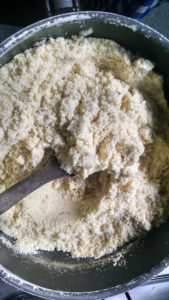 In a frying pan put the olive oil, the smashed garlic, the onions and cook until brown. Turn off the fire and add the whole flour, mixed it very well. Add salt as much as you like.