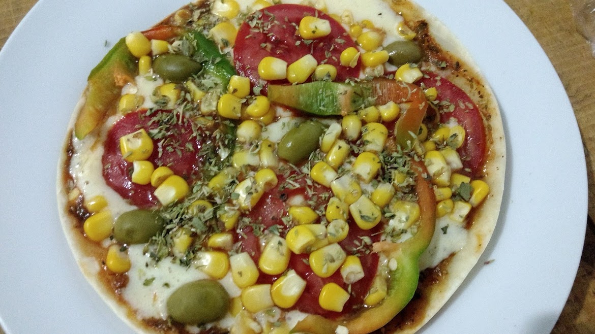 Put the dough in a pan. Mix one teaspoon of oregano to 2 tablespoon of tomato sauce and spread over the dough of pizza. Spread the mozzarella over the pizza, then add tomato, capiscum and corn, spread the olives. Finally, add the olive oil over the whole pizza, and spread 1 teaspoon of oregano and salt to taste. Cook in the stove for about 3 min. Voilá! It is done.