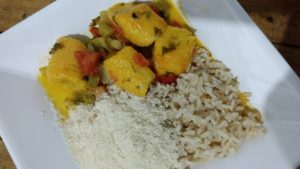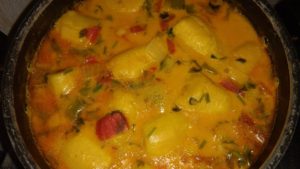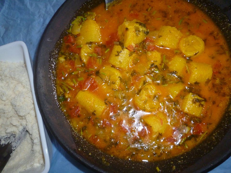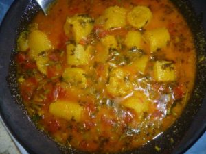 In a pan cook the tomatoes, onion, capiscum with water, coconut juice and oil palm for 10 minutes. The add the plantain and let it cook for more 5 minutes. Turn off the stove and then add the lemon juice and the  coriander and adjust the salt.