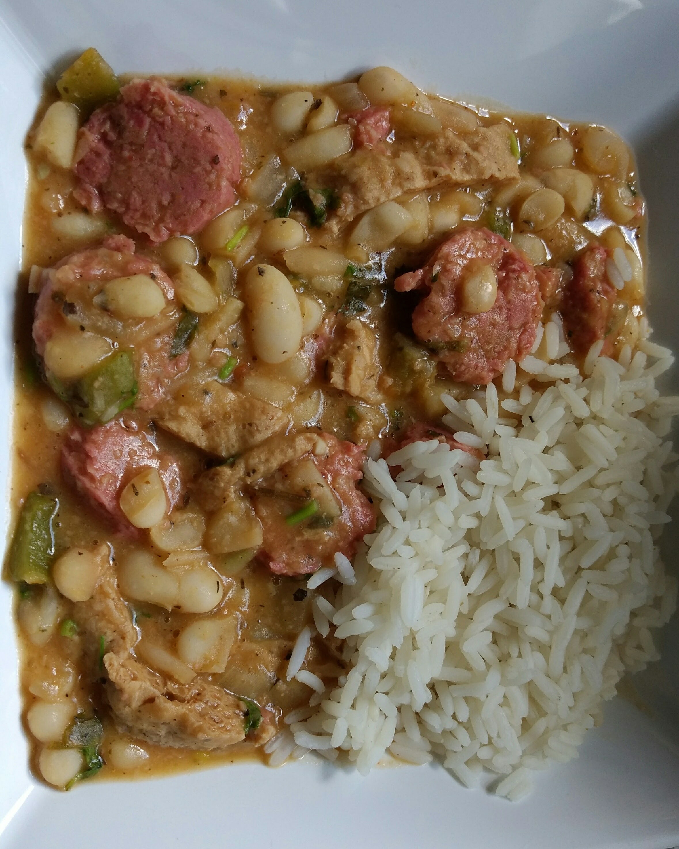Add the sausage and soy cooked in the herbs into the beans and cook until boil. Add the vinegar and it is done. Serve it with white rice.